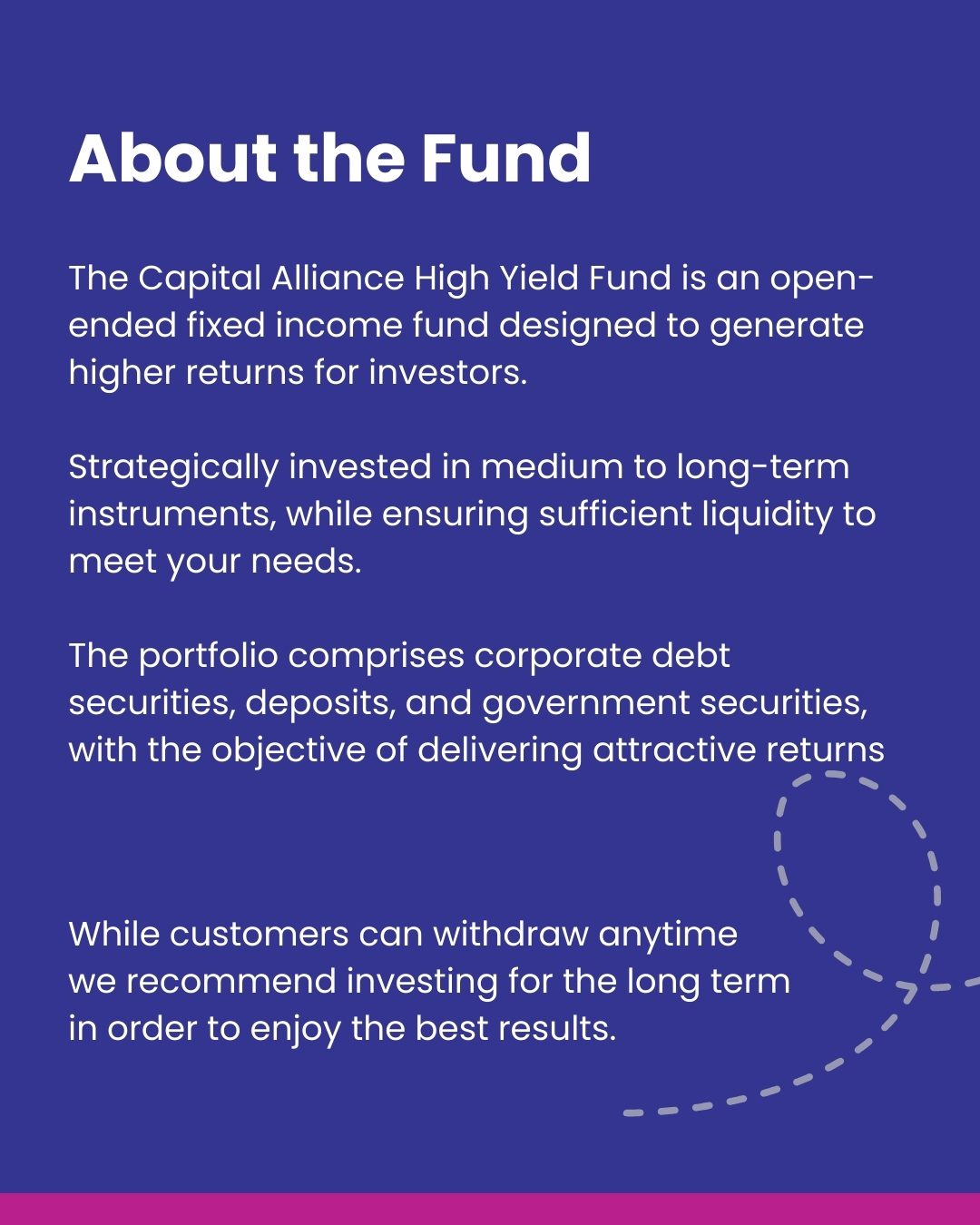 A fixed income fund strategically invested in medium to long-term instruments, with the liquidity to access your funds when you need them. Corporate debt securities, deposits, and government securities all under one fund.